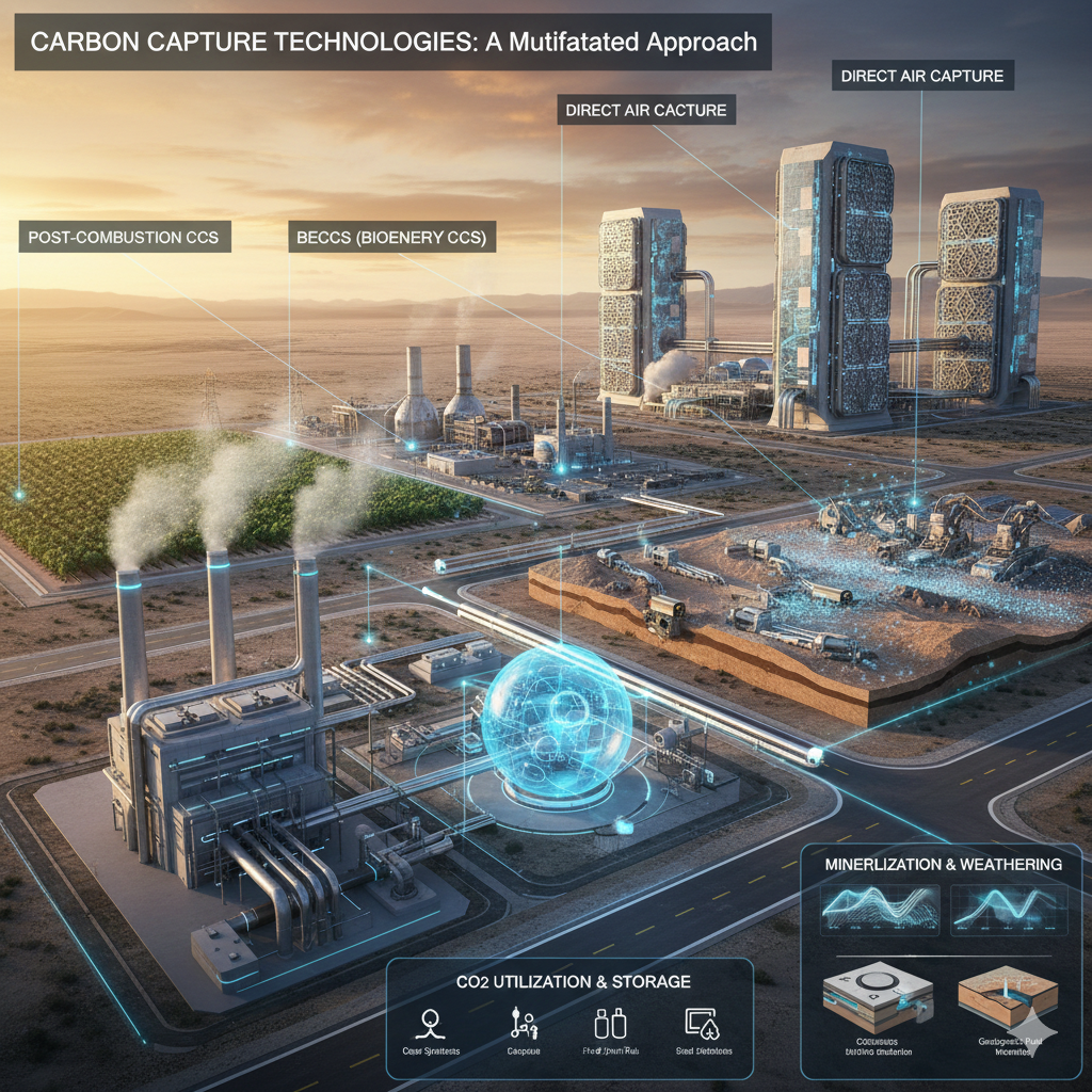 - Almacenamiento geológico permanente: Formaciones salinas profundas o roca basáltica.