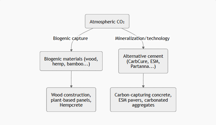 CLT wood, hempcrete, cement-free concrete, and biochar-based composites.