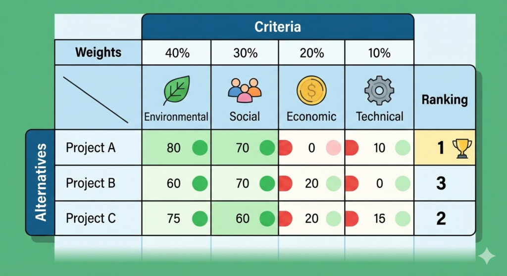 El Análisis Multicriterio es un método de apoyo a la toma de decisiones que permite comparar alternativas considerando de forma simultánea criterios ambientales, sociales, económicos y técnicos. Se utiliza ampliamente en la evaluación de impacto ambiental y en proyectos complejos donde los criterios entran en conflicto y no pueden reducirse a un único valor económico.