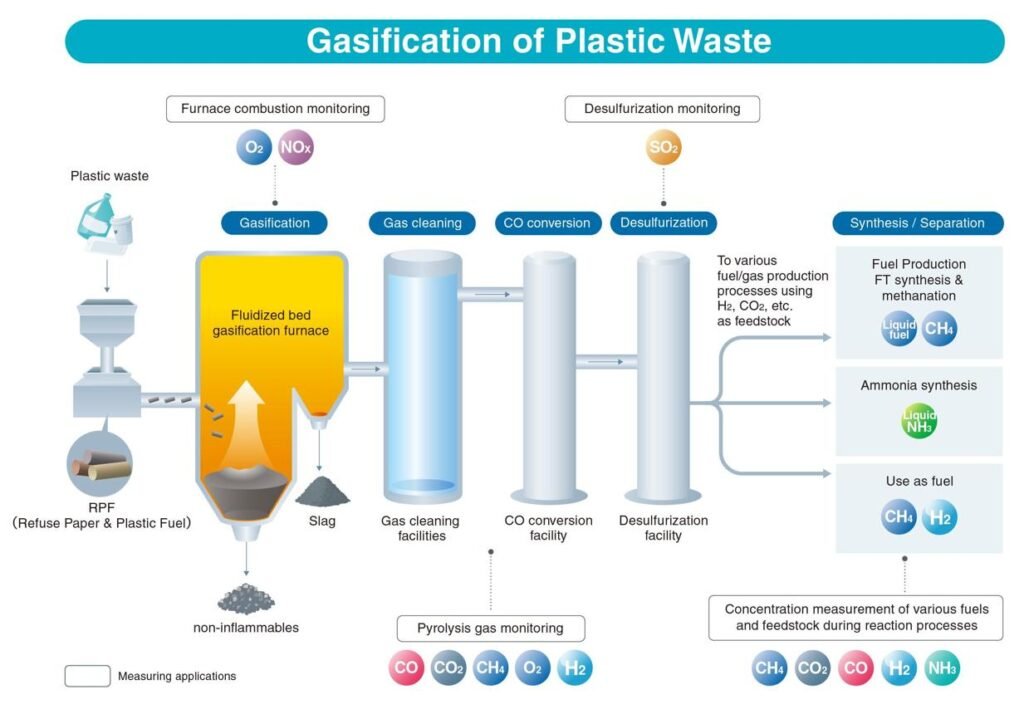 Gasification converts plastic waste into syngas (CO + H₂) at high temperatures.