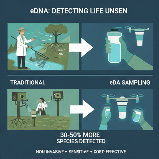 Multiple studies have shown that eDNA detects 30–50% more species than traditional methods, especially in aquatic ecosystems.