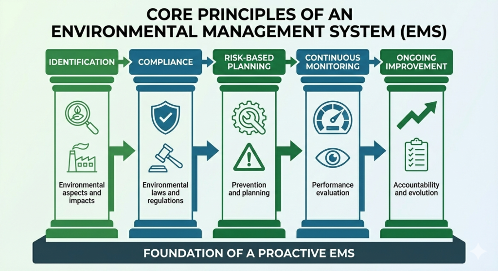 These principles ensure that environmental management becomes a repeatable, measurable, and auditable process rather than a one time effort.
