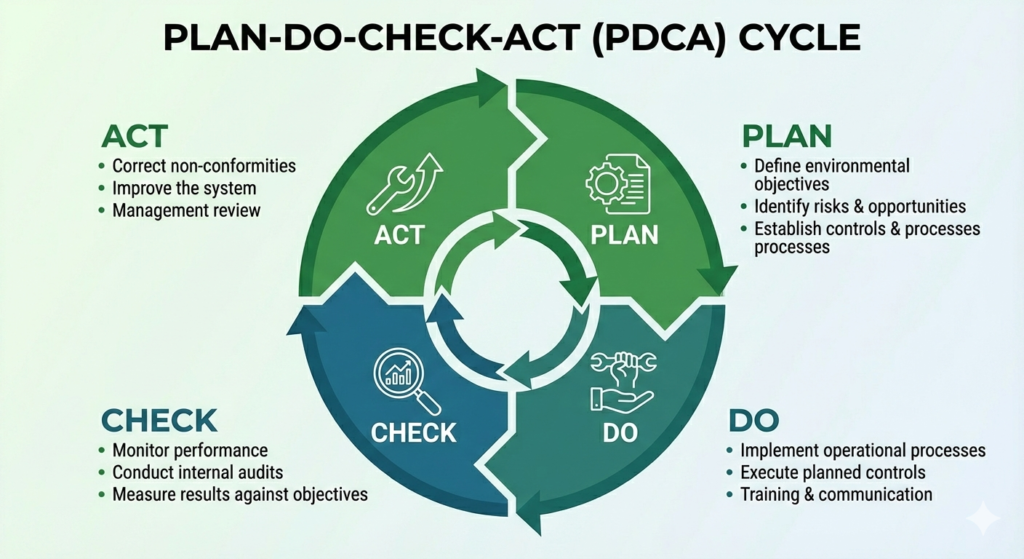 - Plan: Define environmental objectives, identify risks, and establish controls