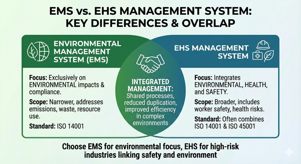 While EMS is narrower in scope, EHS systems are often preferred in high-risk industries where worker safety and environmental protection are closely linked.