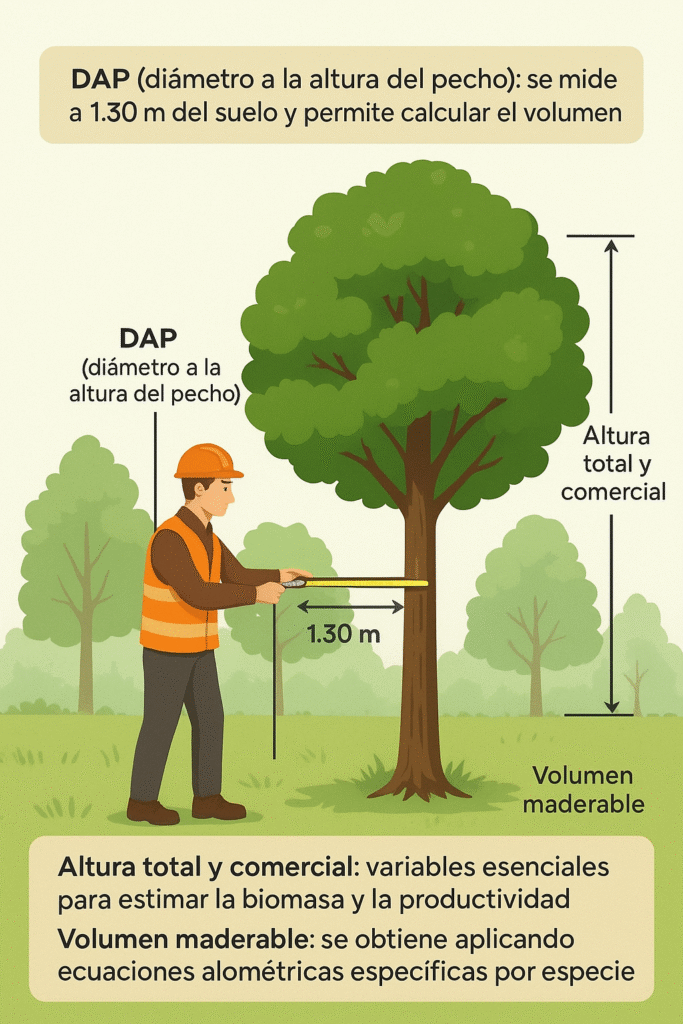La exactitud de un inventario depende de las variables medidas en campo. Estas determinan la calidad de los cálculos posteriores de volumen, biomasa o carbono.
