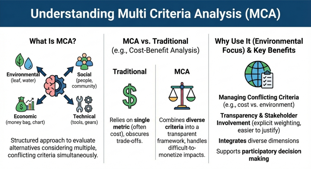 Unlike traditional decision making tools that rely on a single metric (such as cost), multi criteria analysis allows decision makers to combine environmental, social, economic, and technical criteria into a single, transparent evaluation framework.